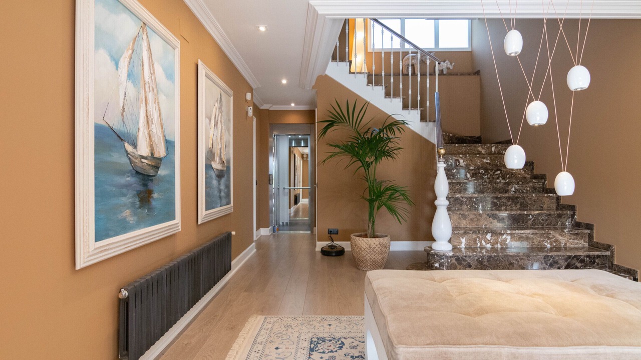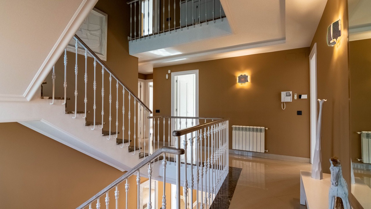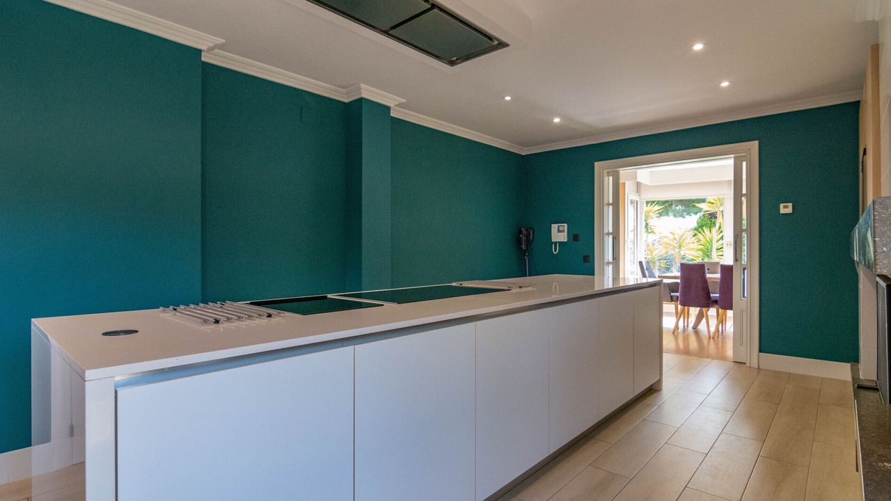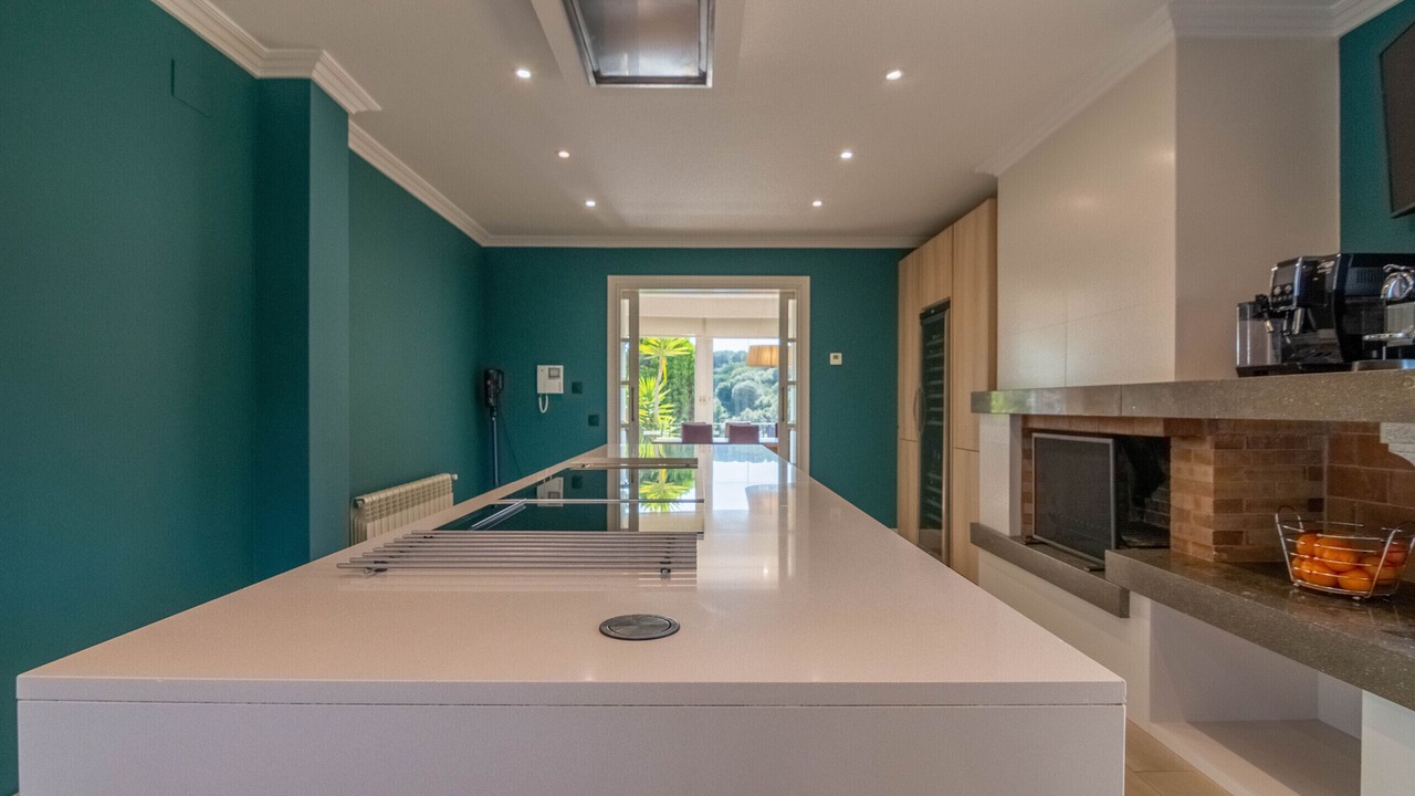 One floor up is the ground floor where you’ll find the large entrance hall. From the hall you access the living room on one side and direct access to the pool area. On the other side of the hall you access the dining room and large modern fully equipped kitchen. Separate toilet on this floor.
